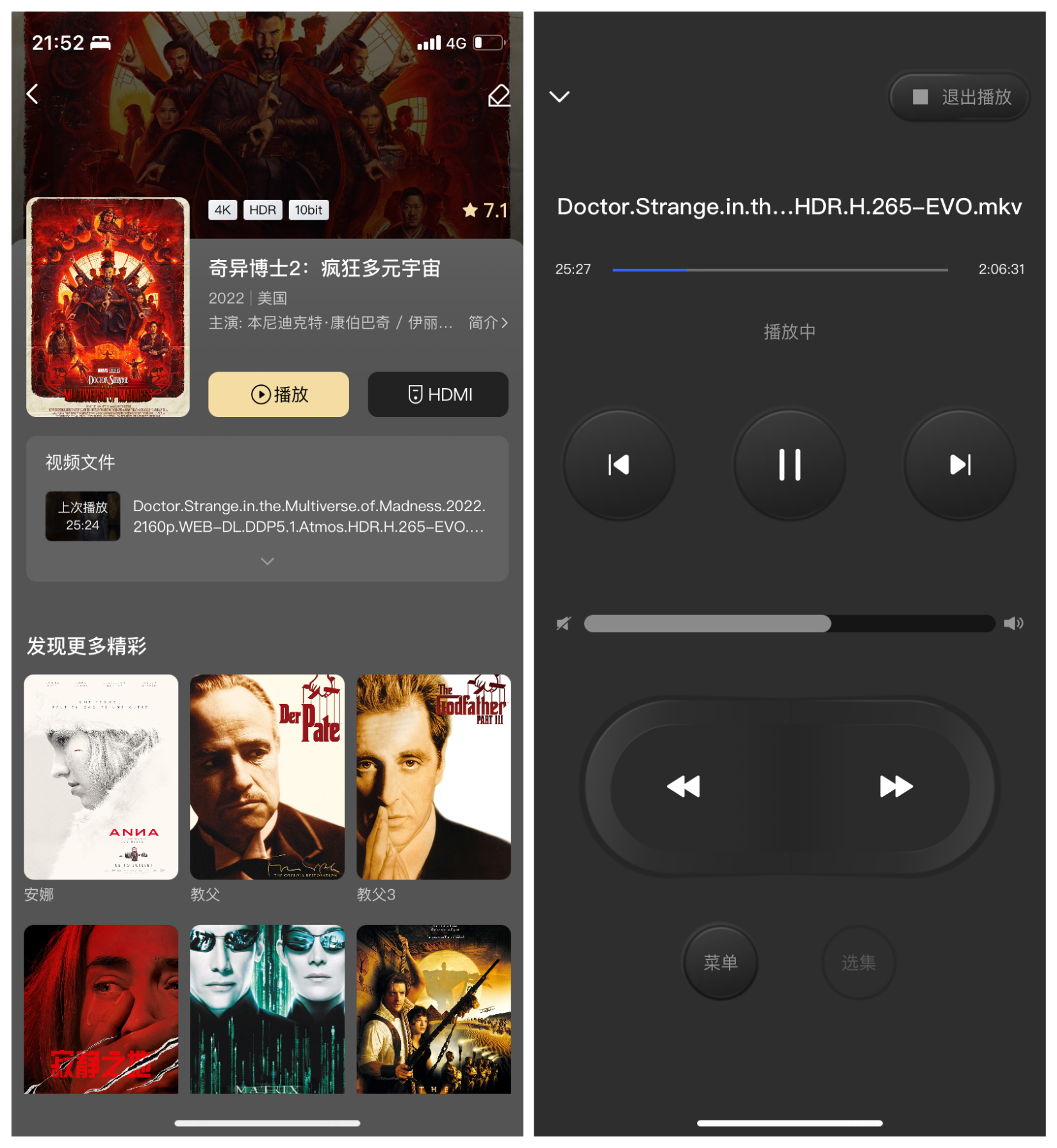 等扫描完成之后可以就可以看到类似极空间的那种海报墙了,Plex也可以全平台安装,意味着在局域网内,任何能够联网的设备都可以安装并播放,所以可在电视上安装并播放,因其海报的刮削及其强大的解码能力广受苹果用户的喜爱,除了收费其他没啥毛病。