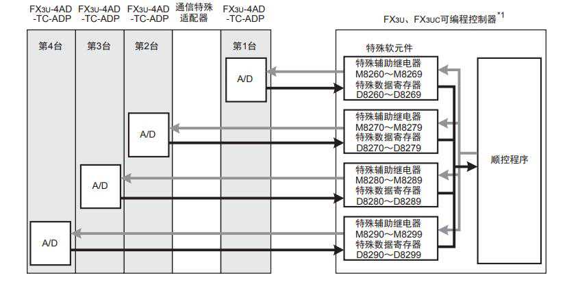1)FX3S可编程控制器上只能连接1台TC-ADP。FX3G、FX3GC可编程控制器上最多可以连接2台*1TC-ADP。FX3U、FX3UC可编程控制器上最多可以连接4台TC-ADP。(包括其它模拟量功能扩展板和模拟量特殊适配器)