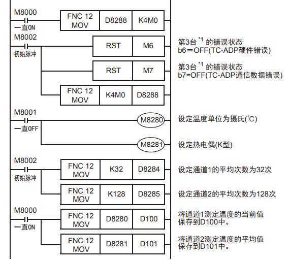 下面的程序是设定热电偶类型为K型,将第1台的通道1、通道2的测定温度(℃)分别保存到D100、D101中。平均次数设定为通道1是32次,通道2是128次。