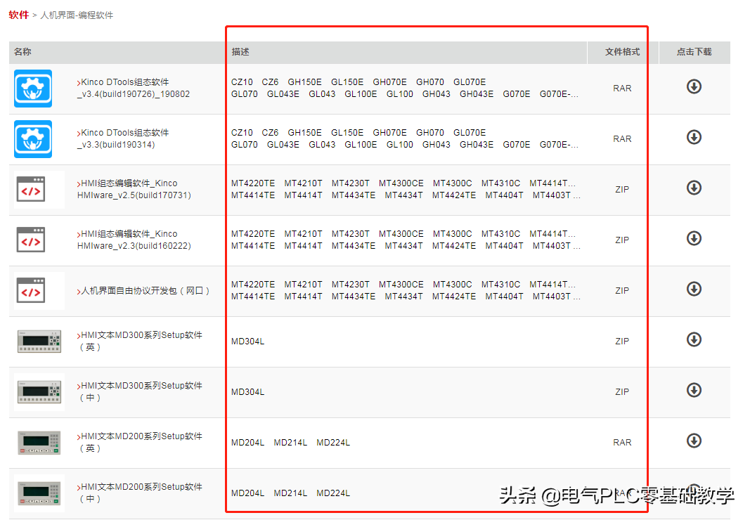打开资料下载后也有相关的资料分类、有软件、有选型手册、使用手册。大家可以根据自己的需求进行下载,在下载的时候大家可以下看看资料的描述,看下描述里有没有你的产品的型号
