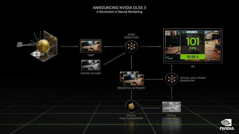 以上这些只是开胃小菜,而RTX40系列GPU的最吸引人之处在于其DLSS3技术,可进一步提升帧率。DLSS3是一款由AI驱动的性能倍增技术,采用了全新第四代TensorCore和GeForceRTX40系列GPU的全新光流加速器驱动,是NVIDIA广受好评的深度学习超级采样技术的最新版本,同时具备开创性的光学多帧生成功能,将为NVIDIARTX神经网络渲染游戏和应用开启新的时代。