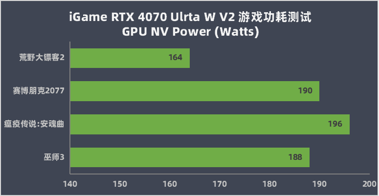 前面我们有提到过,RTX4070的功耗是相当低的,实际上一根8Pin供电就能带动。因此我们还使用英伟达官方的FrameView工具统计了一下各个3A大作中的平均功耗。可以看出,大部分3A大作中iGameGeForceRTX4070UltraWV2的实际功耗都在180-190W左右,这个能效比可谓相当之高。作为一个ITX小主机爱好者,笔者已经开始摩拳擦掌了。