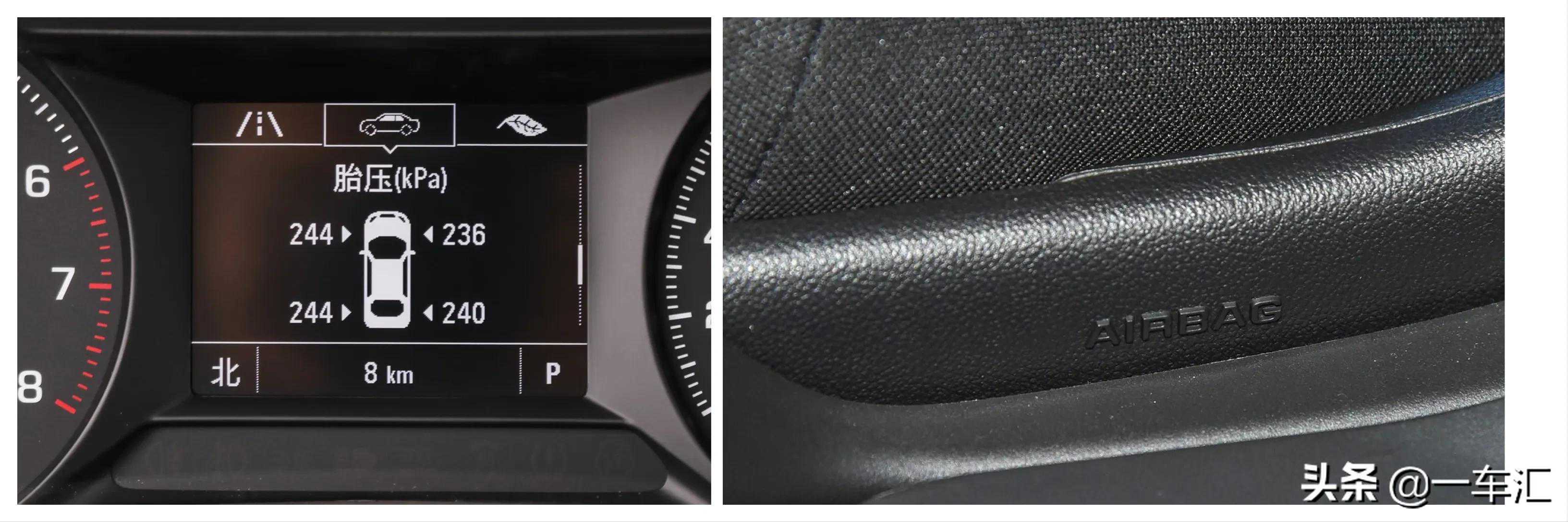车内胎压显示系统,能够在仪表盘中间看到每个轮胎具体胎压数值;车型配备了前排主副驾驶位正面气囊、前排侧气囊,缺少中高配版本上的前后排头部气帘。