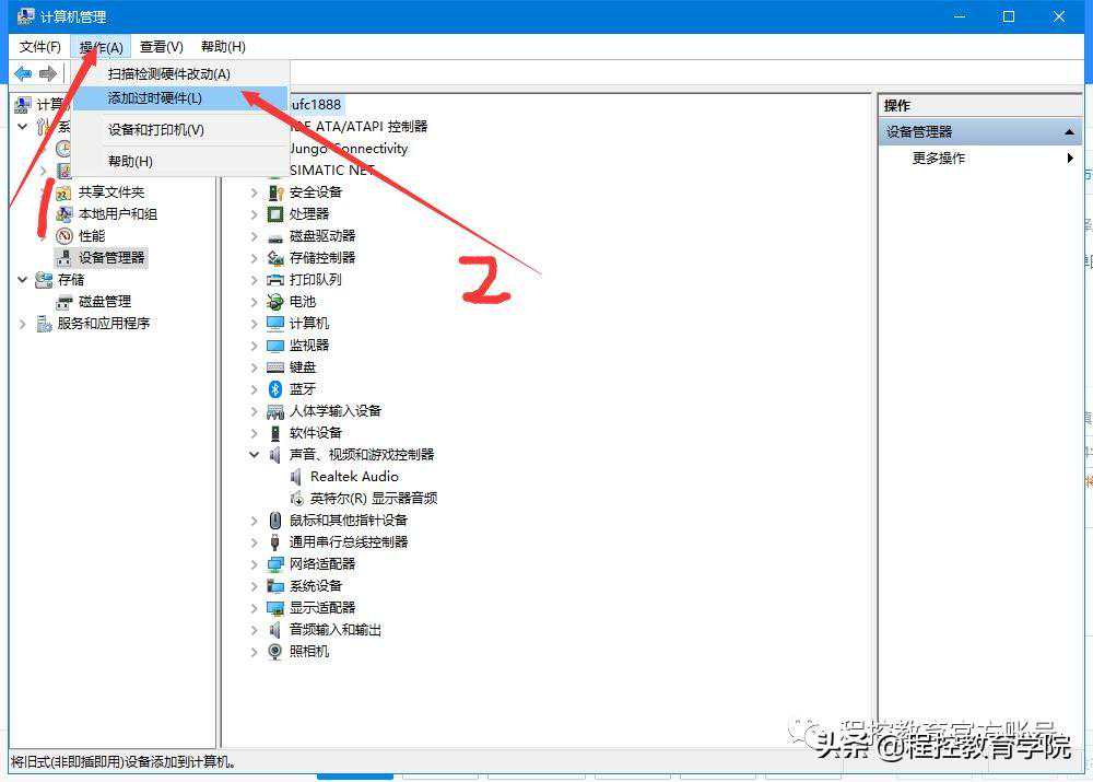 4.单击操作,单击添加过时硬件,然后单击下一步