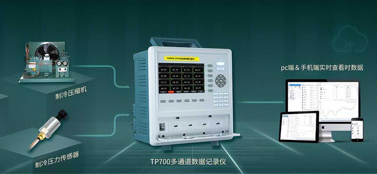 在制冷设备的运行测试中,用TP700多通道数据记录仪我们可以测制冷压缩机的工作电压,电流,频率,功率因数,功率,可以测试冷凝器的温度,蒸发器的温度,测试冷凝管的压力和蒸发器管的压力。