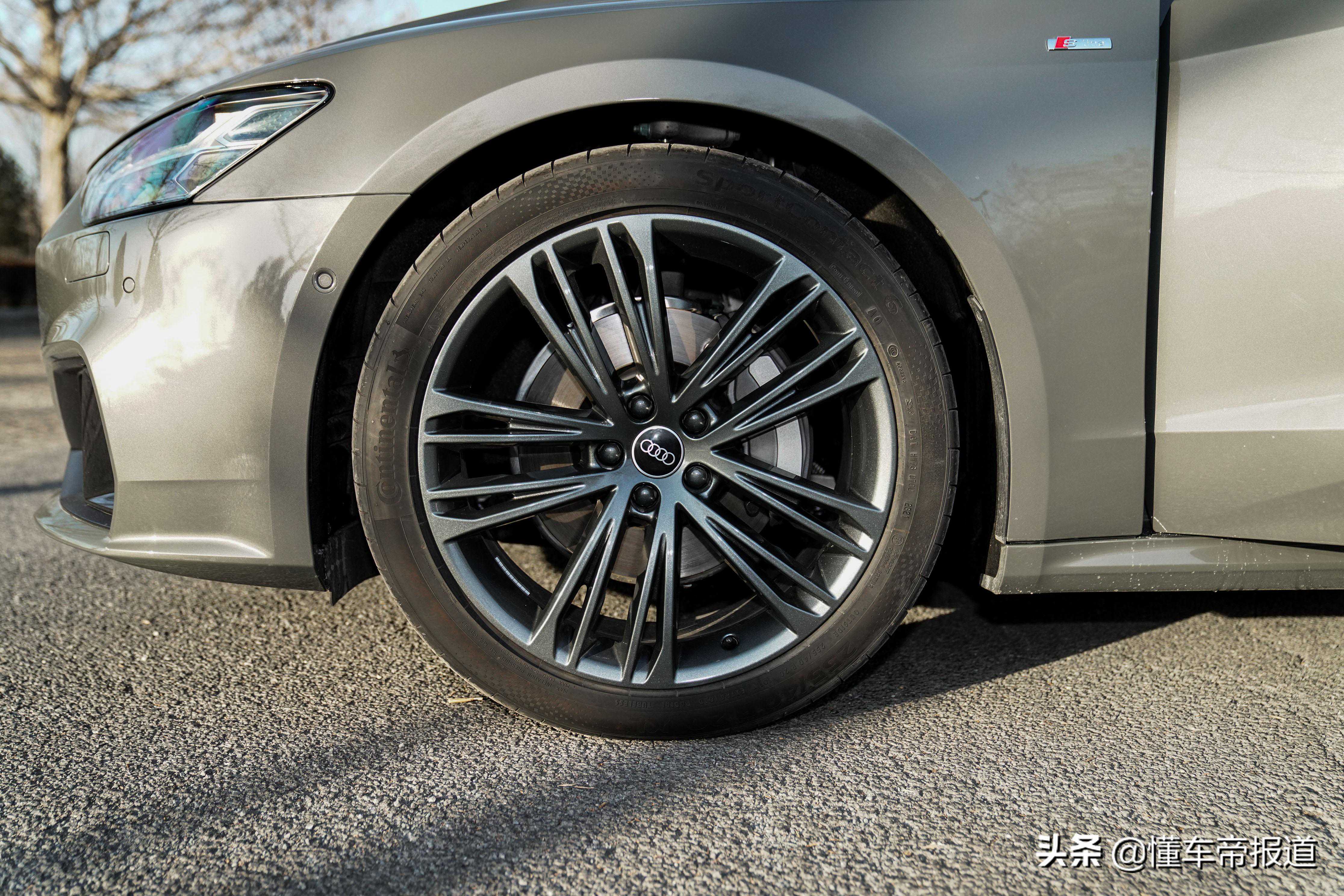 我们实拍的2022款奥迪A745TFSI臻选型的轮辋从19英寸升级为20英寸,规格为255/40R20,轮辋表面采用了枪灰色设计,密辐条式造型并没有表现出新车的运动感,反而体现出一种优雅从容的调性。此外,新车所搭载的SportContact6系列轮胎主打操控和抓地性能,应对奥迪A7的马力输出,丝毫不在话下。