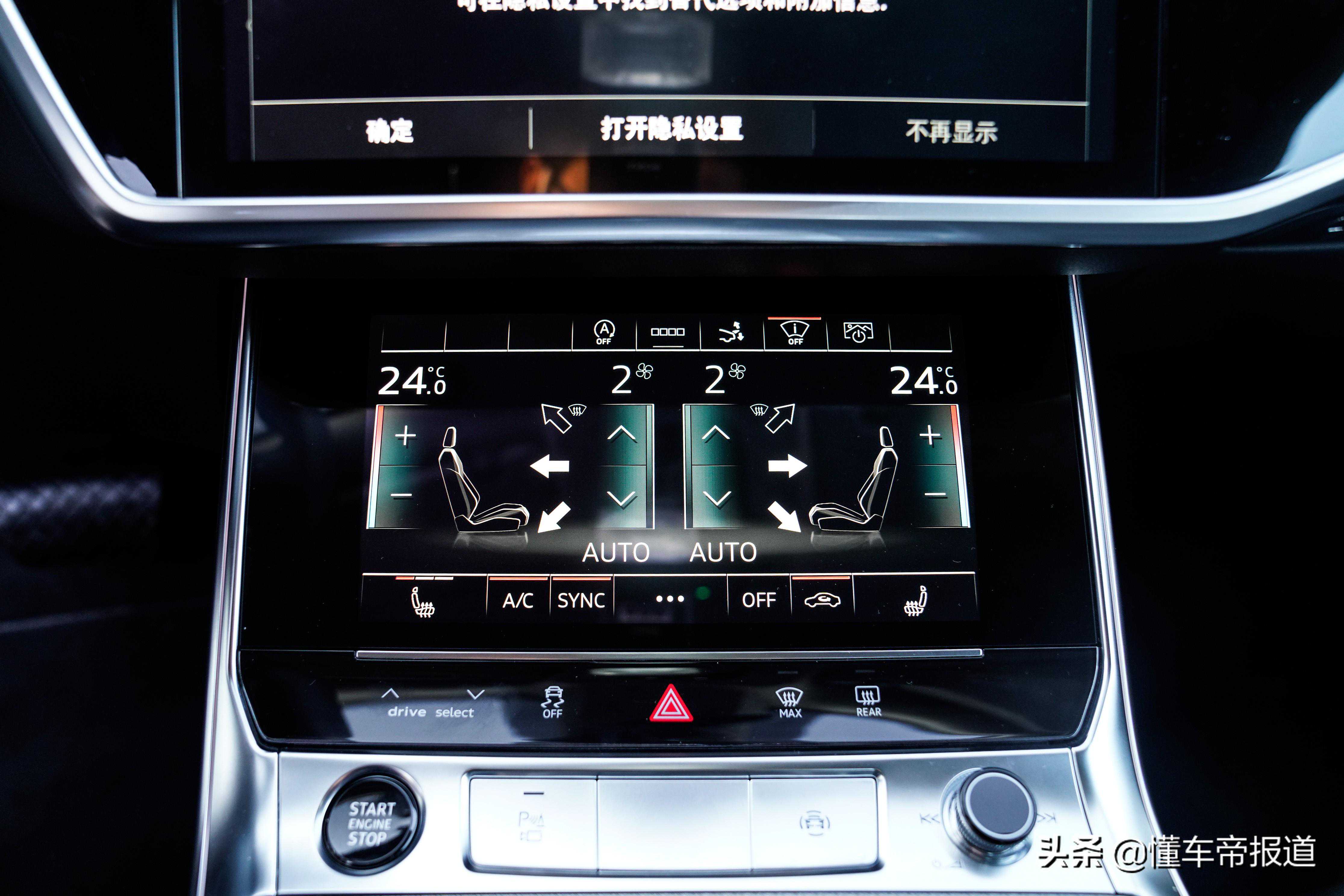 下方则是空调控制面板,可通过按压或者滑动的方式来对风量和温度进行调节。除此之外,该车的座椅加热、座椅通风以及后备厢开启也均在这里进行控制。