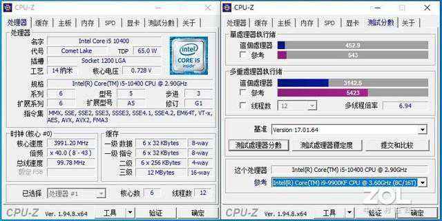 在CPU-Z中,英特尔酷睿i5-10400的多核心分数为452.9,单核心的分数为3142.5。
