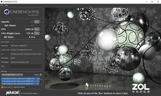 CINEBENCHR15的测试中,英特尔酷睿i5-10400的多核心分数为1058,单核心的分数为172。