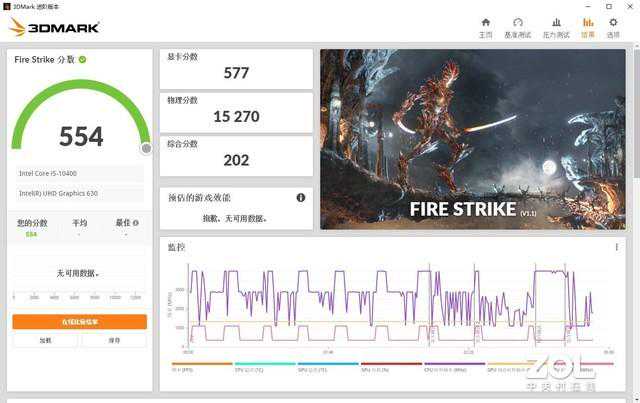 图形能力测试的关键是处理器以及显卡,FireStrike主力发挥依旧是英特尔酷睿i5-10400,承担了CPU和显卡的责任。