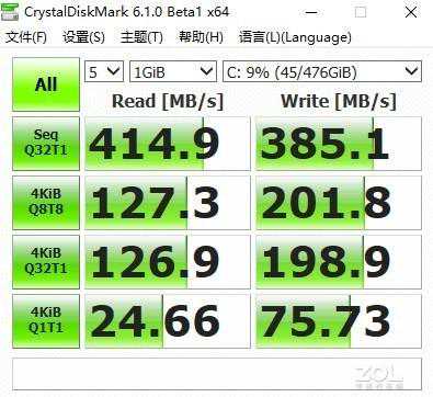 台电C24装备了一款的512GB的固态,固态硬盘有机械硬盘不可比拟的读写速度,接下来就用CrystalDiskMark测试一下它的读写能力。
