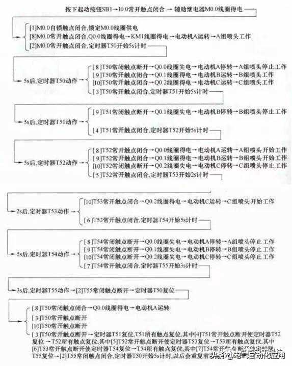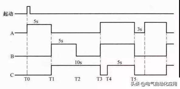 当按下起动按钮后,A组喷头先喷5s后停止,然后B、C组喷头同时喷,5s后,B组喷头停止、C组喷头继续喷5s再停止,而后A、B组喷头喷7s,C组喷头在这7s的前2s内停止,后5s内喷水,接着A、B、C三组喷头同时停止3s,以后重复前述过程。按下停止按钮后,三组喷头同时停止喷水。下图为A、B、C三组喷头工作时序图。