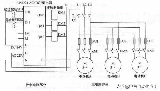系统要求用两个按钮来控制A、B、C三组喷头工作(通过控制三组喷头的泵电动机来实现),三组喷头排列如下图所示。