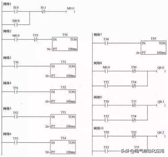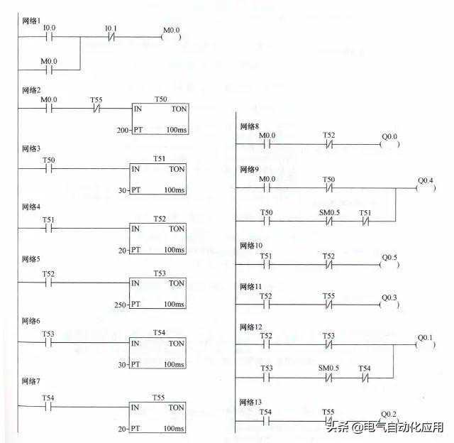 在上图所示的梯形图中,采用了一个特殊的辅助继电器,称为触点利用型特殊继电器,它利用PLC自动驱动线圈,用户只能利用它的触点,即画梯形图里只能画它的触点。能产生周期为1s的时钟脉冲,其高低电平持续时间各为0.5s,以上图梯形图网络9为例,当T50常开触点闭合,在1s内,常闭触点接通、断开时间分别为0.5s,线圈得电、失电时间也都为0.5s。