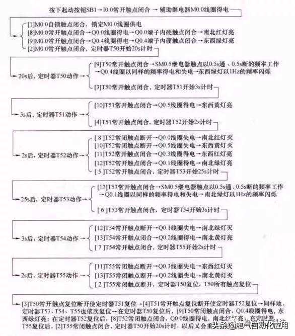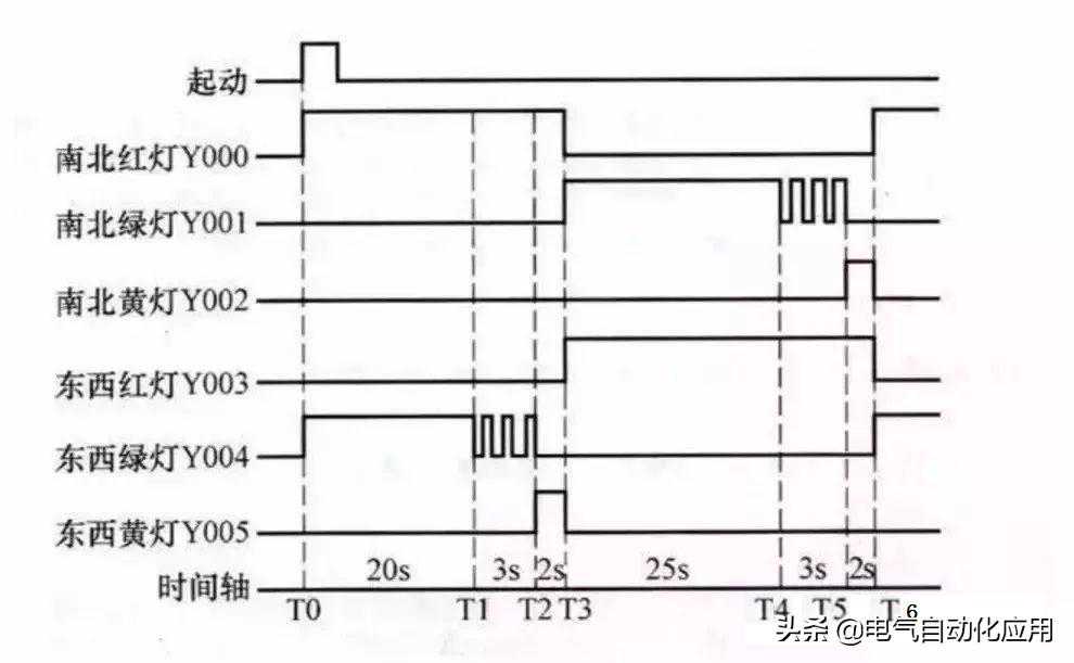 当按下起动按钮后,南北红灯亮25s,在南北红灯亮25s的时间里,东西绿灯先亮20s再以1次/s的频率闪烁3次,接着东西黄灯亮2s,25s后南北红灯熄灭,熄灭时间维持30s,在这30s时间里,东西红灯一直亮,南北绿灯先亮25s,然后以1次/s频率闪烁3次,接着南北黄灯亮2s。以后重复该过程。按下停止按钮后,所有的灯都熄灭。交通信号灯的工作时序如下图所示。