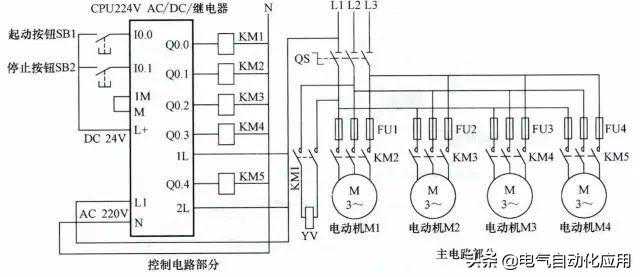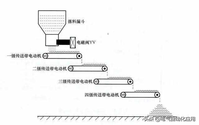 当按下起动按钮后,电磁阀YV打开,开始落料,同时一级传送带电动机M1起动,将物料往前传送,6s后二级传送带电动机M2起动,M2起动5s后三极传送带电动机M3起动,M3起动后4s后四级传送带电动机M4起动。