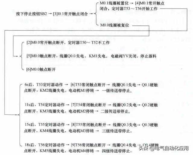 当按下停止按钮后,为了不让各传送带上有物料堆积,要求先关闭电磁阀YV,6s后让M1停转,M1停转5s后让M2停转,M2停转4s后让M3停转,M3停转3s后让M4停转。