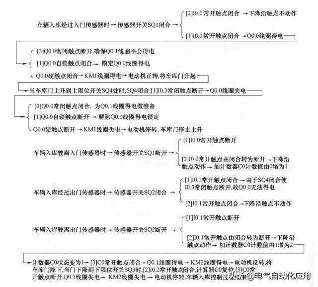 在车辆入库经过入门传感器时,入门传感器开关闭合,车库门电动机正转,车库门上升,当车库门上升到上限位开关处时,电动机停转;车辆进库经过出门传感器时,出门传感器开关闭合,车库门电动机反转,车库门下降,当车库门下降到下限位开关处时,电动机停转。