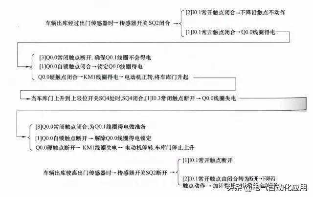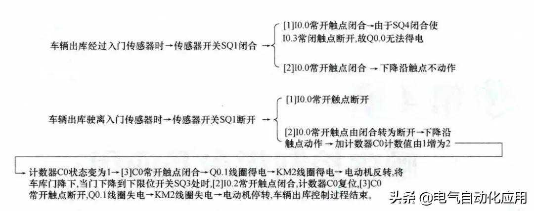 在车辆出库经过出门传感器时,出门传感器开关闭合,车库门电动机正转,车库门上升,当门上升到上限位开关处时,电动机停转;车辆出库经过入门传感器时,入门传感器开关闭合,车库门电动机反转,车库门下降,当门下降到下限位开关处时,电动机停转。