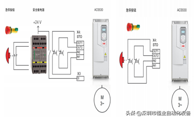在实施急停ENISO13849/PLe功能时可根据具体情况决定接触器的使用。如果急停按钮与变频器之间距离很长,安全继电器可实现额外的诊断,以检测布线中的短路情况。如果急停按钮与变频器之间的布线距离较短,无需安全继电器也可实现ENISO13849/PLe功能,并能很好地降低短路的风险。这对设备制造商是很有用的,尤其是当他们需要将急停电缆拉到机器内部的时候。