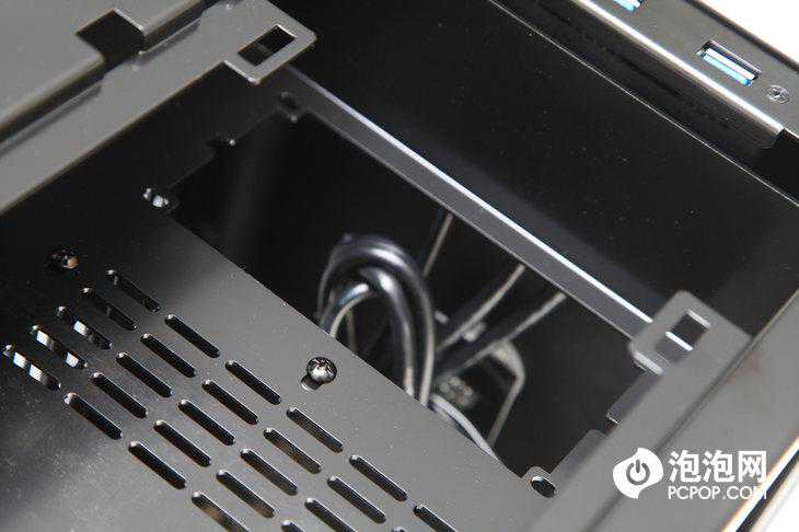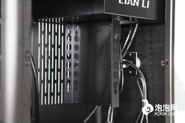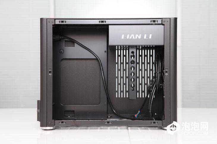 因为联力PC-Q38迷你机箱通透的机箱设计,机身内部几乎没有与大多数普通机箱一样的大面积背板设计,对于苦于理线的ITX机箱用户来说,杂乱的线材隐藏往往成为一大难题,而联力PC-Q38迷你机箱通过很好的分区处理解决了这一问题,大胆的利用预留的3.5英寸硬盘支架对内部空间进行了分区,部分线材可通过机身背板穿过,而主要线材可藏在面板前的多余空间内。