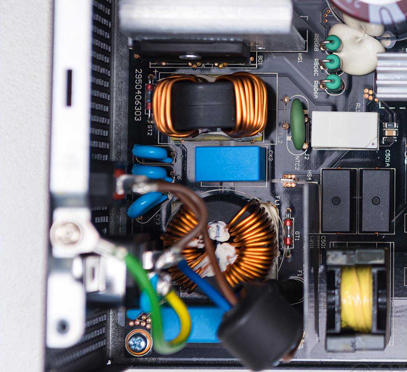 整流桥部分有配备了一个独立散热片,增强热交换,蓝色的是PFC储能电感,最上面黑色的散热片背部3个意法半导体的PFC开关管。
