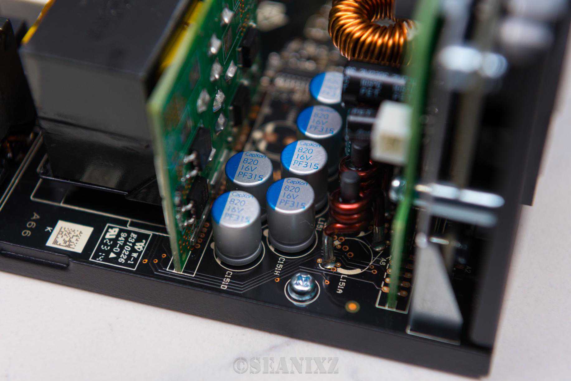 下面的固态电容是台湾丰宾820μf16VPF315,也有两个空位,850W版本减掉了一些配置,如果是从1000W缩下来的话,用料其实也还算不错。