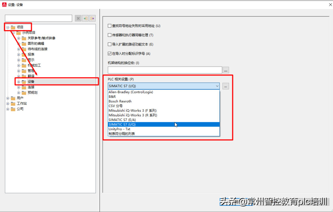 在选项菜单栏中选择“选项”,在“项目”→“设备”中有一个PLC相关配置,在配置中可以选择PLC所对应的型号,也可以进行自定义配置,如下图所示。