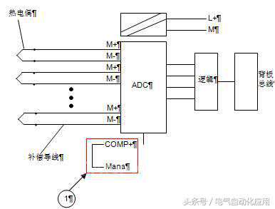 图3类型:热电偶通过补偿导线连接到参比接点,再用铜质导线连接参比接点和模板的输入端子构成回路,同时由一个补偿盒对模板连接的所有热电偶进行公共补偿,补偿盒的9,8端子连接到模板的补偿端COMP+(10)和Mana(11),所以模板的所有通道必须连接同类型的热电偶。
