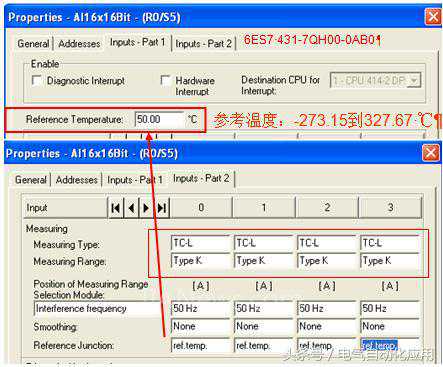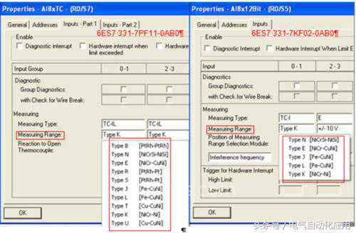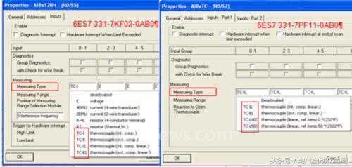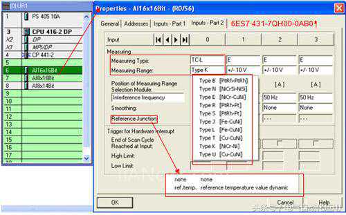 首先要在硬件组态选择与外部补偿接线一致的measuringtype(测量类型),measuringrange(测量范围),referencejunction(参比接点类型)和referencetemperature(参比接点温度)的参数,如下各图所示。