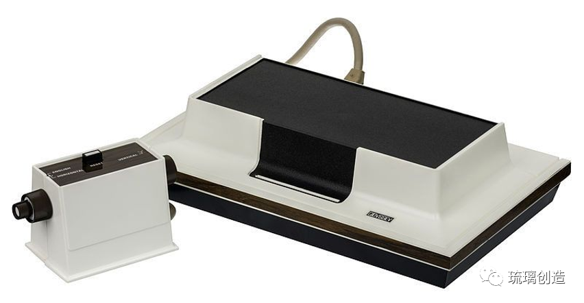 奥德赛就长这个样子(见下图),有个摇杆,计算的性能只有方块。在此之前大家在说游戏机应该长什么样,很多人认为游戏机跟电视应该是一体的。奥德赛创始人觉得游戏机不应该是跟电视一体的,而应该是电视机的一个外设,这个外设可以和电视机里的内容进行互动。