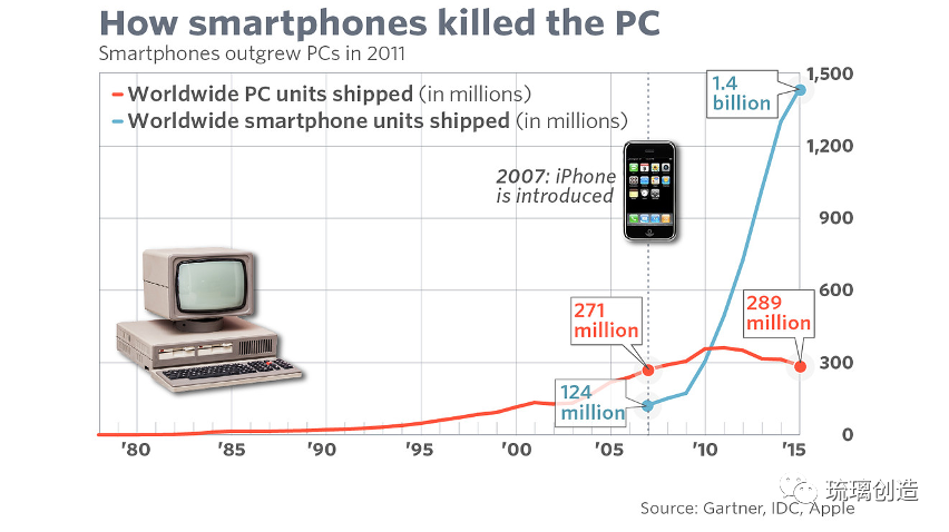我们今天讲PC这个单词,PersonalComputer,是IBM的人去定义的。在这之前IBM太小看这件事情了,一开始它们觉得个人电脑没用,家里怎么会需要这个东西呢。后来发现各个厂卖得还不错,就很快速地响应市场去做了,并且定义了这个名字。这里面其实有个蛮有意思的插曲,1977年AppleII出来,到IBMPC1981年发布,中间隔了三四年,为什么IBM还能有机会?再看智能手机,2007年iphone出来,2010年微软和诺基亚这两家就一起开干了,却并没有机会。这是为什么?