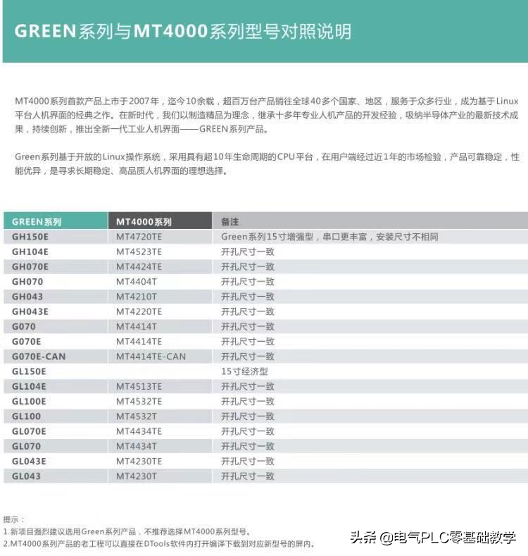 现在回到我们的正题,来看下步科的触摸屏软件如何下载,目前步科主推的屏幕是GREEN系列的触摸屏,此系列的触摸屏是为了替代MT4000相关的触摸屏,看下替代一览表。图上有GREEN系列的优点,有兴趣的可以看一看