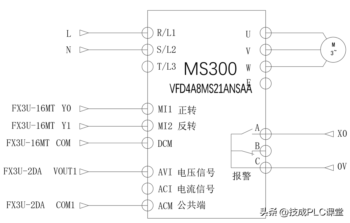 有一套变频器控制的电机,需要使用PLC的模拟量控制,控制示意图如下