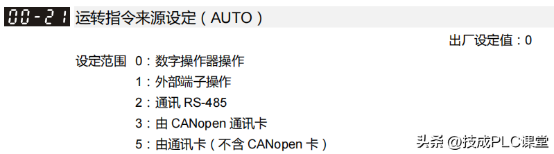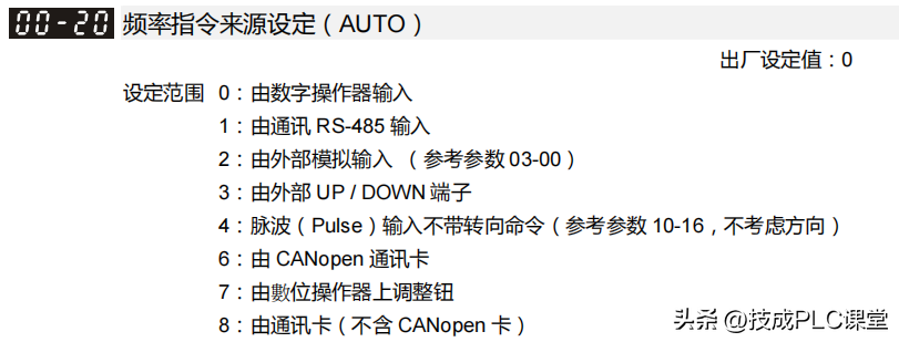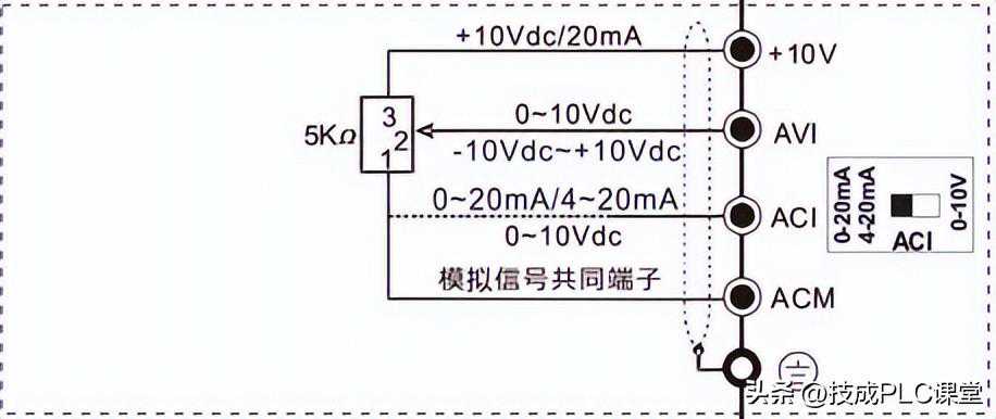 模拟量控制可以选择电压信号(AVI端子)或者电流信号(ACI端子),从上面接线可以看出选择的是电压信号。