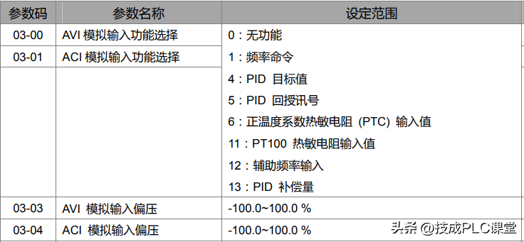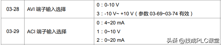 03-00设置为1,表示AVI端子作为频率源输入,03-28参数设置为0,表示接收0-10V电压信号,00-03默认100%,这样0~10V电压就能控制电机0~50HZ频率。