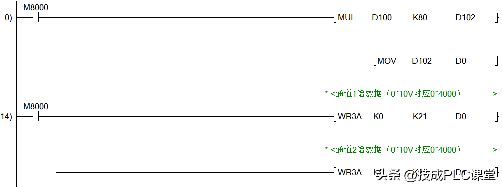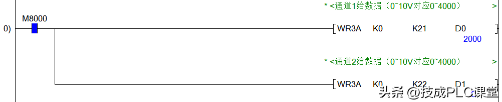 2、2DA模块程序编写(此种写法只适合3U的PLC,2N的不行,K21:通道1,K22:通道)