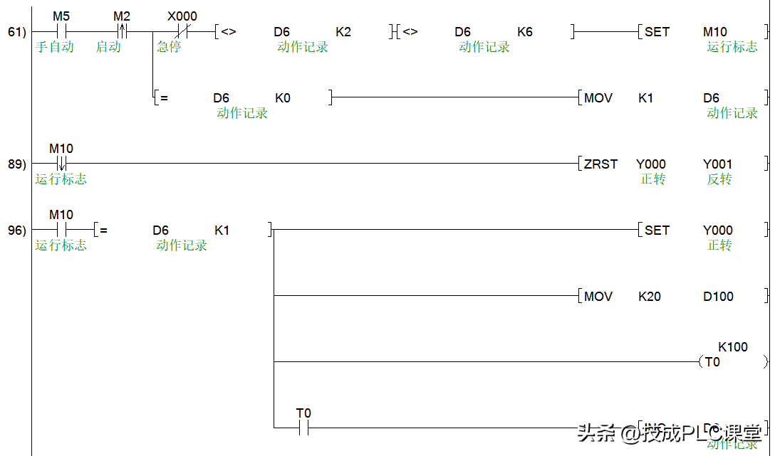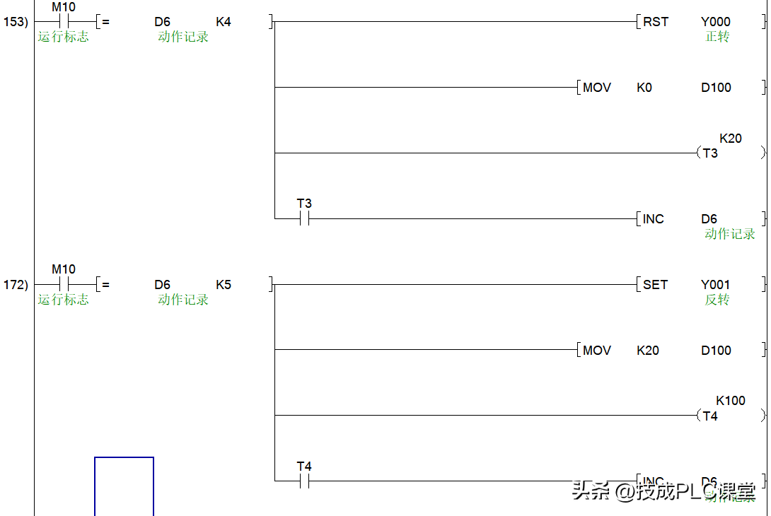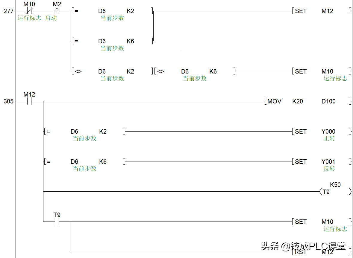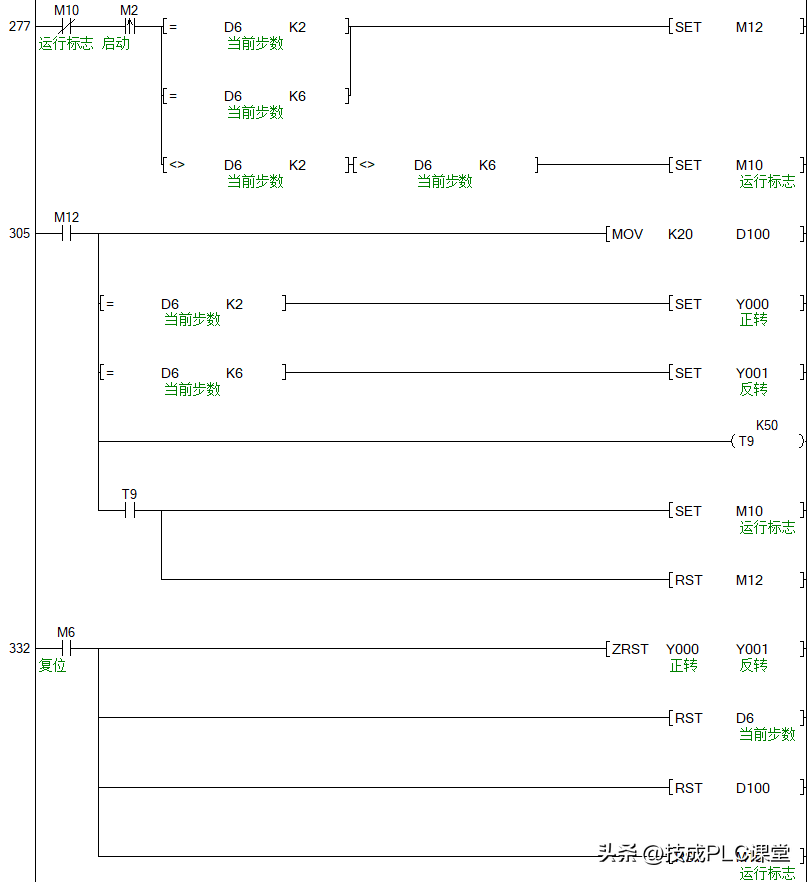 这里面的D6不等于2和不等于6,这两步是电机50HZ运行时的步数,我们通过其他的程序去启动,当设备处于0步时,进入第一步运转。控制以20HZ的频率运行10s,时间到了就人D0加1,D6会等于2,动作进入第二步。