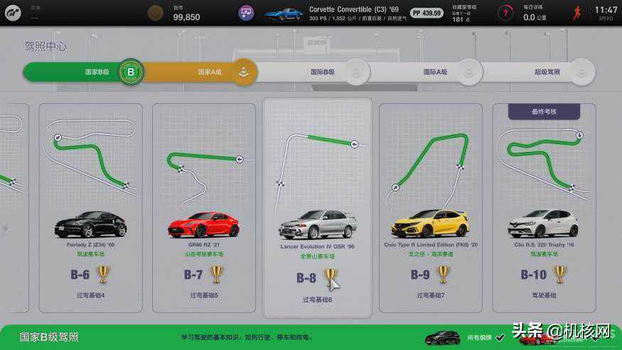 作为系列的特色之一,驾照系统的回归可以说是对新手还是老手的又一大照顾了。在《GT7》中,驾照分为了“国家B级”、“国家A级”、“国际B级”、“国际A级”和“超级驾照”五个等级。想要考取驾照,就需要完成该难度下的一系列的科目考试,难易度自然也是从简单到困难依次递增的。