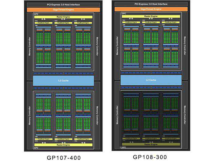 如果不算上和消费者八竿子打不着的GP100核心,NVIDIA已经借着GTX1080、GTX1060、GTX1050一共发布过GP104、GP106、GP107三款核心。而GT1030继续接棒使用的是GP108-300-A1核心,也就是第四款Pascal核心。那么我们首先来复习一下,除使用在TeslaP100加速卡上的GP100大核心之外,Pascal架构的其他核心依然是每组SM单元容纳128CUDA,8组纹理单元(TMUs),位宽及光栅单元(ROPs)随架构衰减,因此完整的帕斯卡规律是:GP104核心当中的20*128=2560CUDA,8*32Bit显存控制器,8*8=64ROP。而接下来的GP106核心则是10*128=1280CUDA,6*32=192Bit,6*8=48ROP,8*6=48TMUs,而距离我们最近一次的GP107核心更减一步:6*128=768CUDA,6*8=48TMUs,4*32=128Bit,4*8=32ROPs。按照这个规律读者完全可以通过以下信息脑补除GP108核心的架构图: