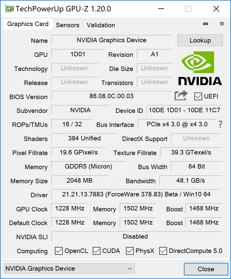 GT1030搭载的GP108核心一共拥有384CUDA,也就是3组SM单元,如果没有意外的话这也是帕斯卡架构的最小组成单位。仅剩的2组显存控制器组成64Bit位宽,最后由两组ROP单元组成16ROPs单元,这部分都不会有太多疑问,但唯一的惊喜是,不知道是不是GPU-Z识别问题,将纹理单元TMUs识别成32个,按照规律这需要4组SM单元才能实现。