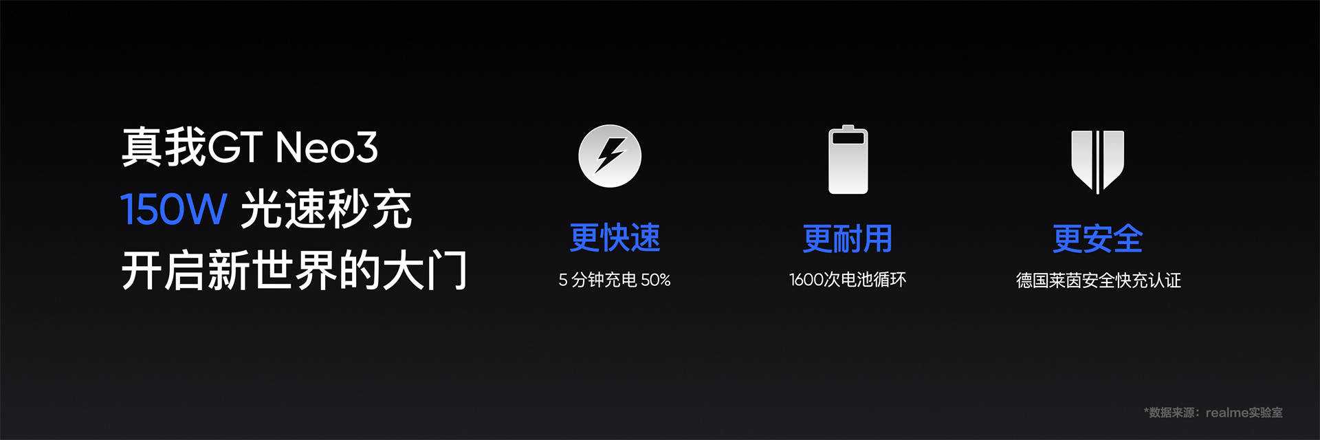 这次realme真我GTNeo3最大的亮点就是在快充方面,全球首发150W光速秒充技术,可实现“5分钟充电50%”。原理上采用深度定制闪充芯片和全新4:2大功率充电架构,提升电池充电转化率,全面提升充电速度。且通过BatterySense电芯电压检测技术,精准匹配充电策略,进一步缩短充电时间。在安全性上,其通过莱茵安全快充认证,拥有多达38重安全防护,真正做到从充电器到电池电芯的全方位保障。
