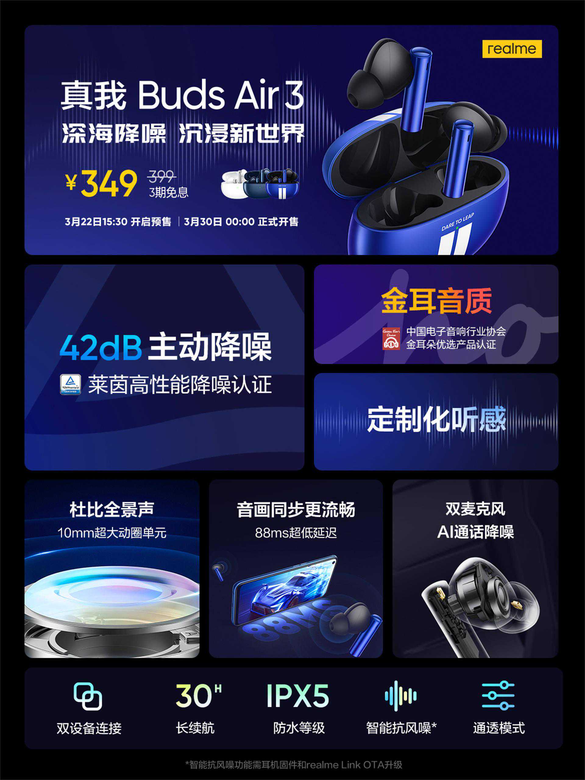 全新发布的realme真我BudsAir3外观冲击力十足,采用7涂7烤+UV喷涂工艺设计而成,看上去质感满满。同时,realme真我BudsAir3还是全球首款通过德国莱茵TÜV高性能降噪认证的TWS耳机;此外,realme真我BudsAir3也颠覆了“百元听个响”的刻板印象,其拥有着10nm超大动圈,CGEC认证金耳音质,不论是高中低音都有不俗的表现。