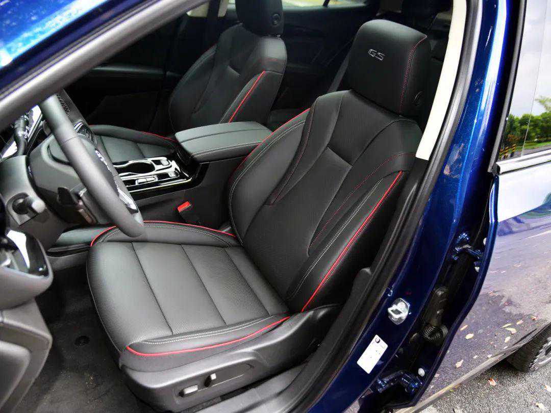 宽大的座椅舒适度很高,红色的缝线和GS标识在视觉上是个加分项。实际乘坐方面包裹性不错,填充物较为柔软,主驾座椅带有六向电动调节,并且前排座椅标配加热功能。