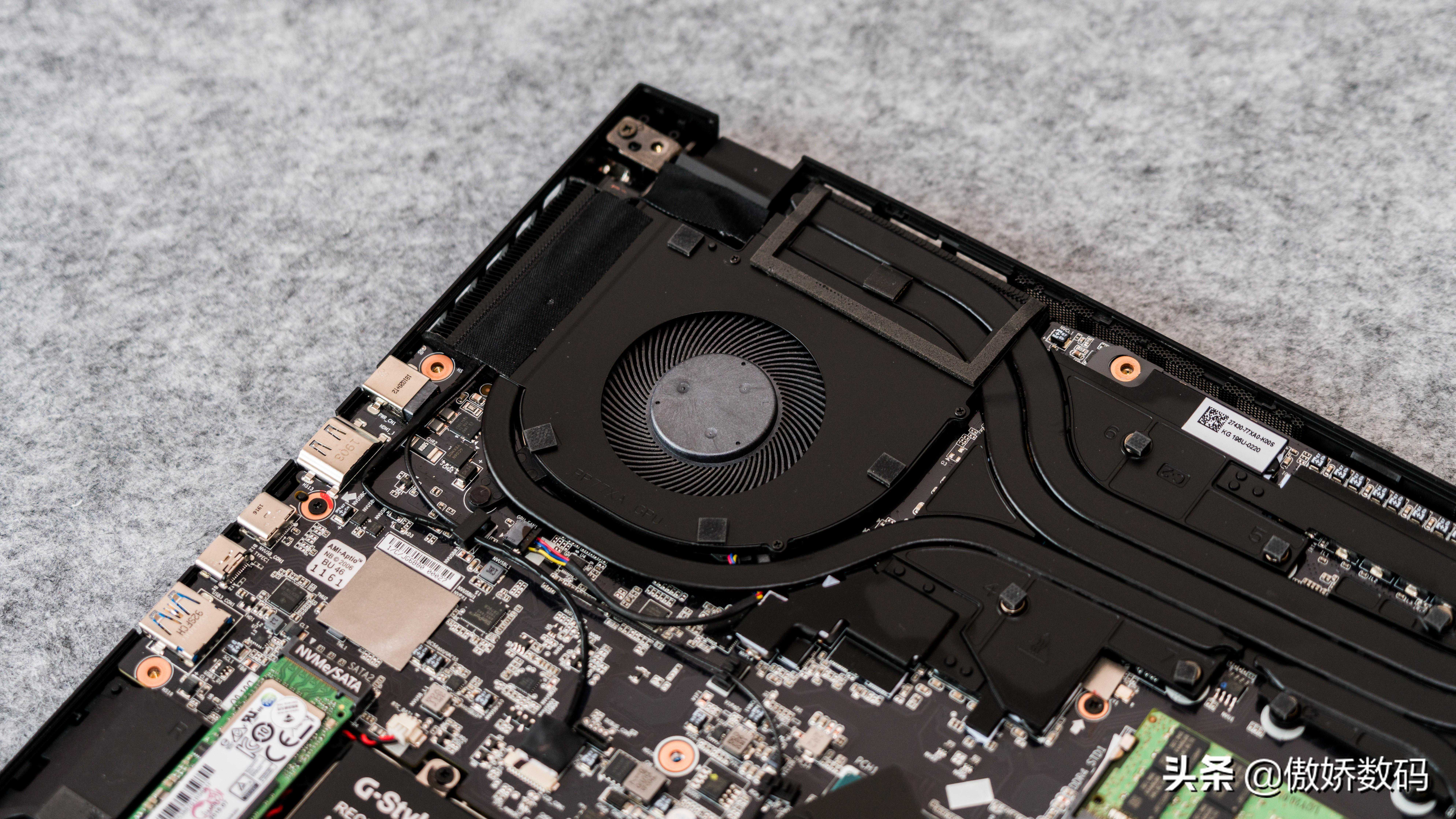 先来看看对性能影响最大的散热系统,由中部贯穿显卡和CPU的两根热管以及左右分别独立的一根热管组成,让两边都拥有等效三热管的散热规模以及两个风扇出风口。左边是显卡,硕大的散热片覆盖了核心、显存以及供电三部分
