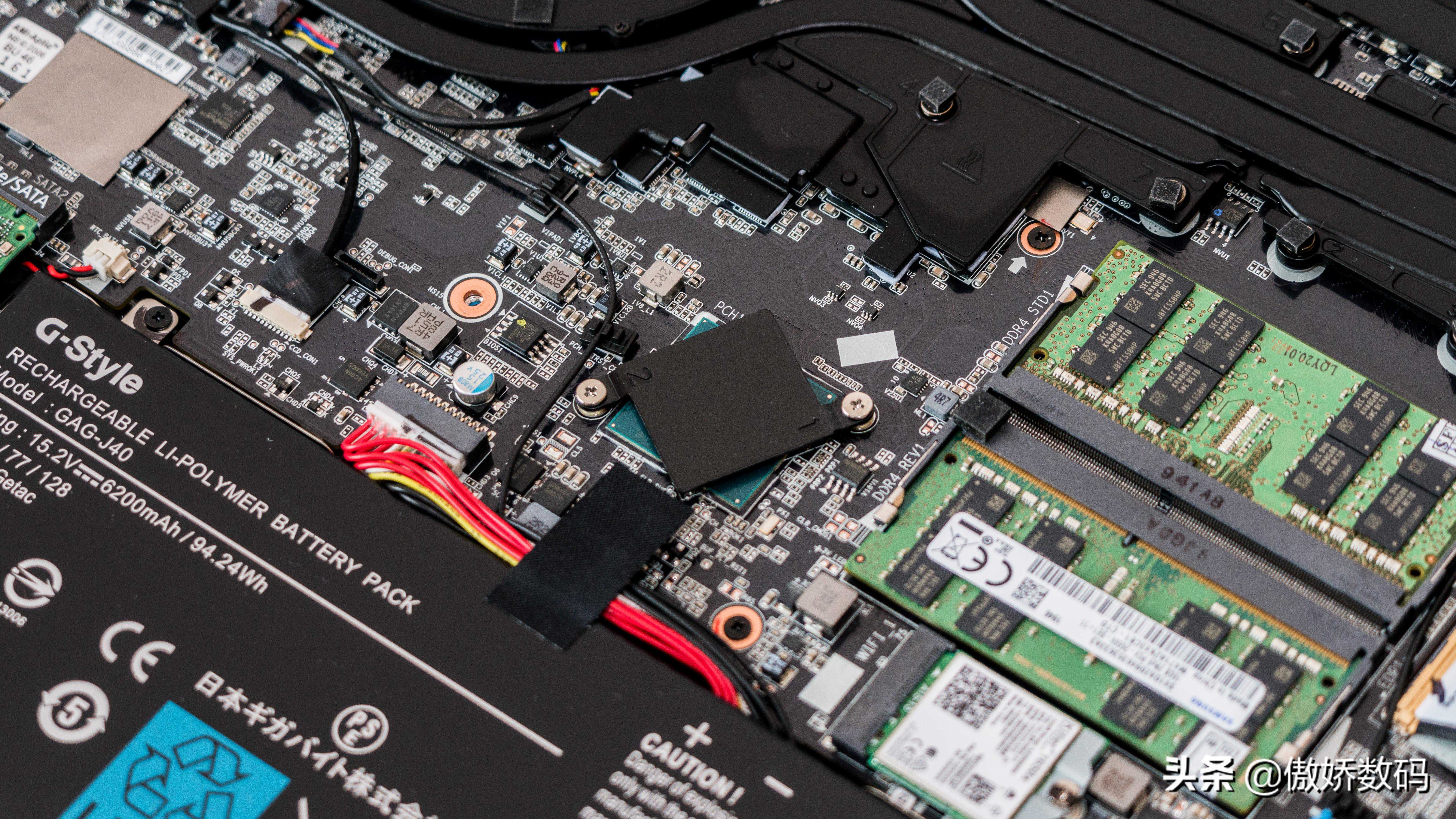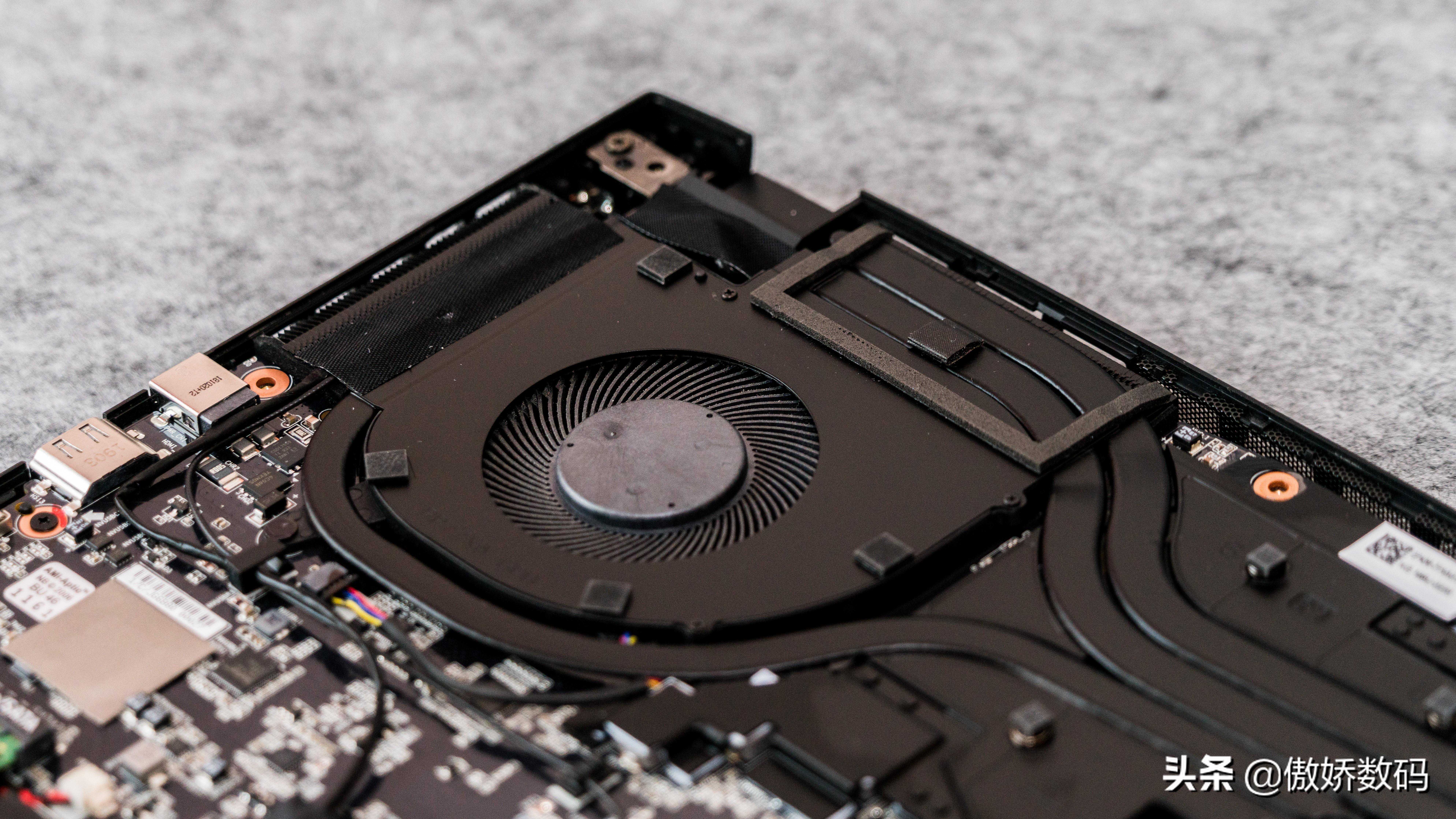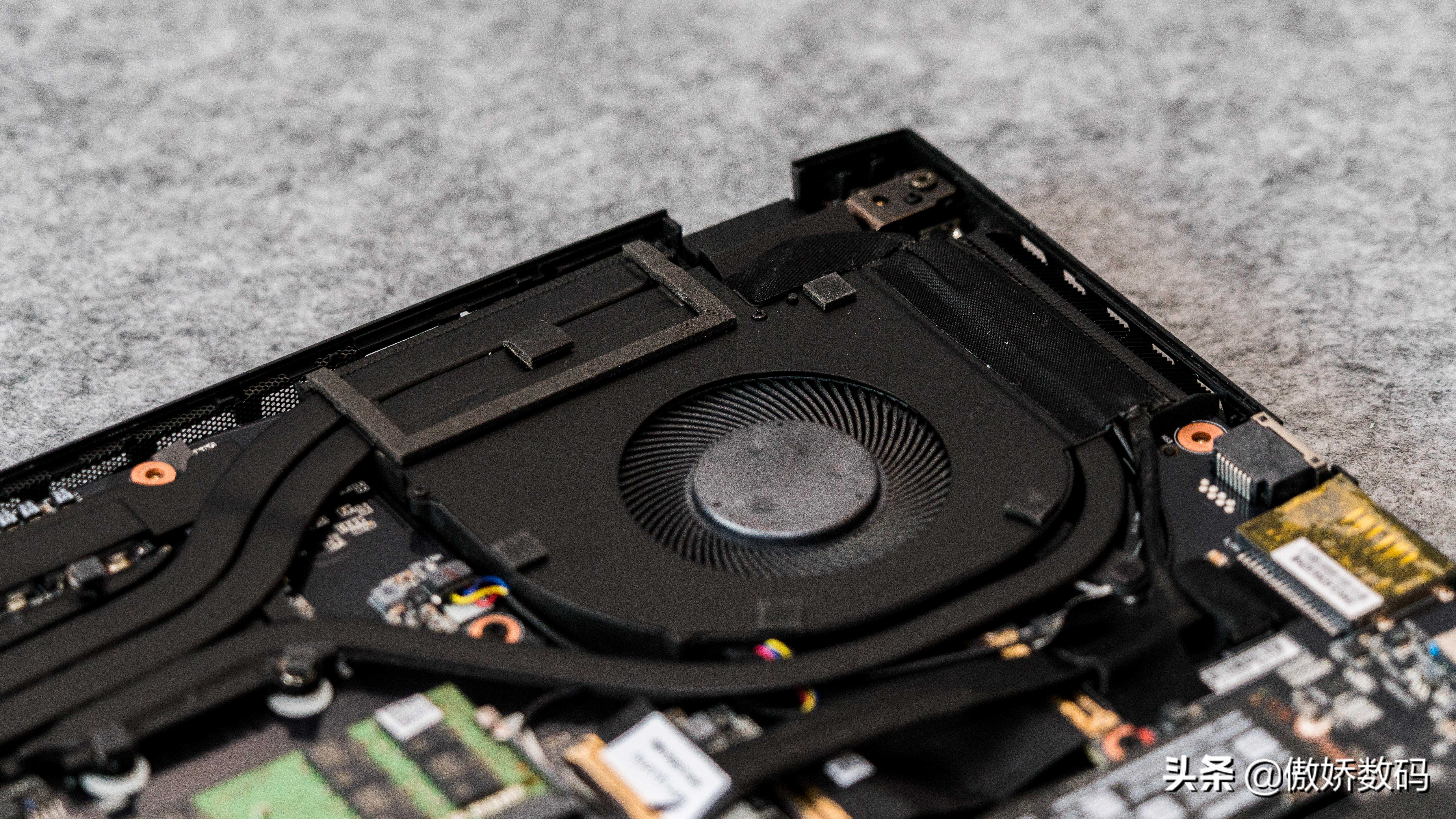 整机内部元件就是这样,大致分为三部分,分别是上方的散热,中部的内存板卡,和最下方的电池