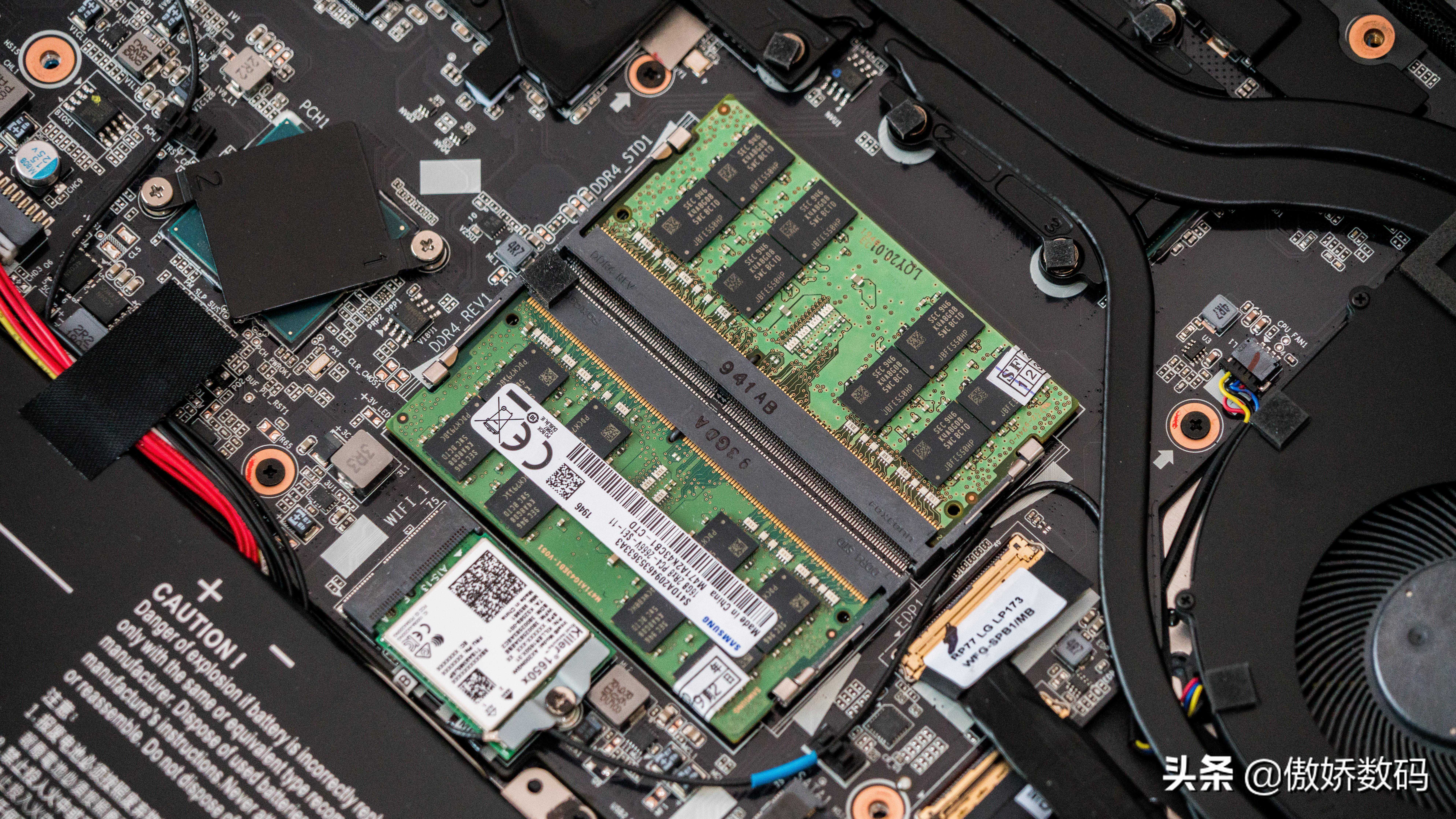 中间板卡部分主要包括两根可更换的内存条和killer1650无线网卡(采用IntelAX200芯片,支持WiFi6),直接一步到位升级成了两根16g原厂三星内存,32g的内存怎么也能用个三五年不落伍了。不足的是2666频率稍低而且HM370芯片组没有超频能力