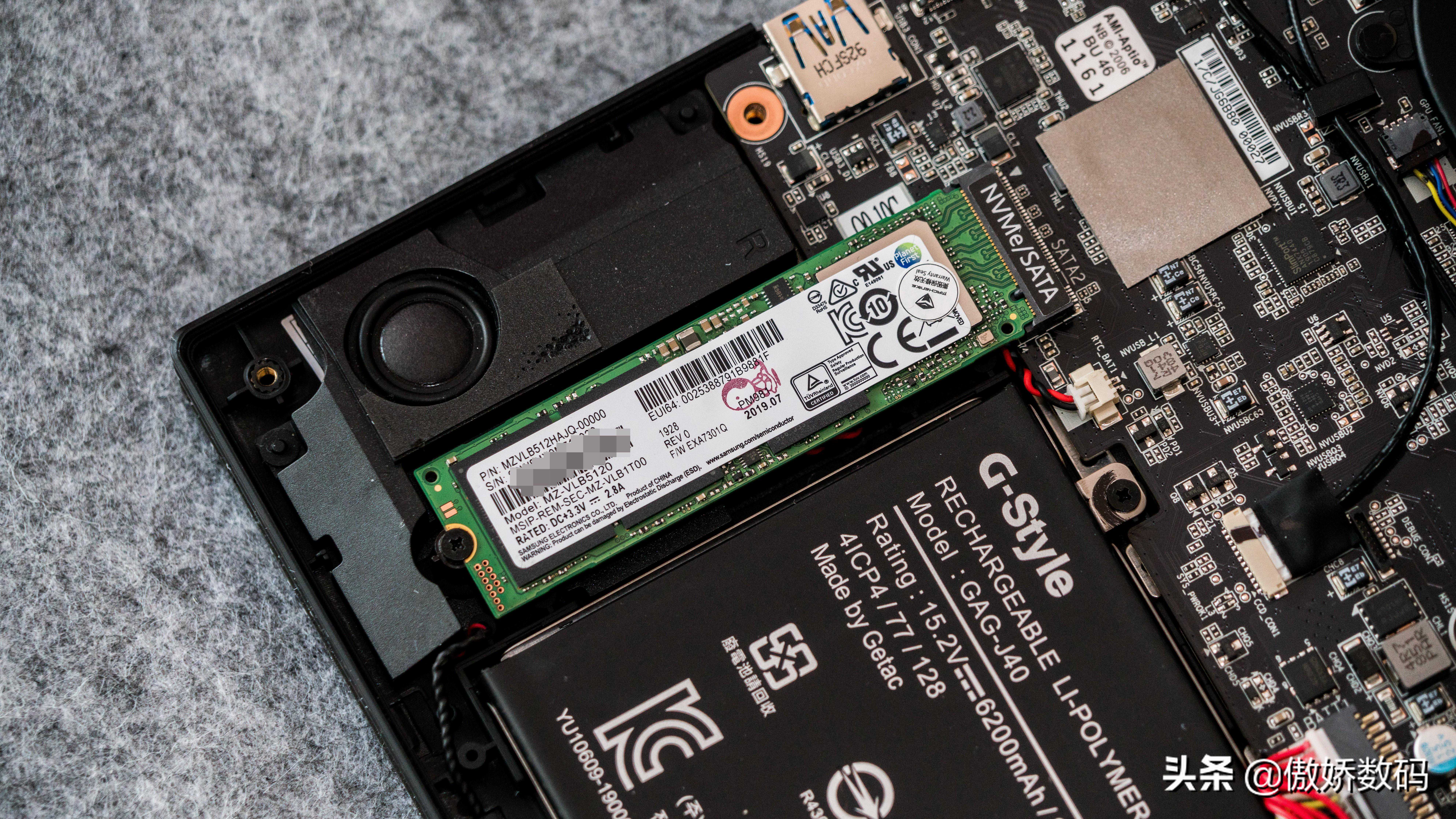 另外单配了一根三星PM981,同样是512g容量。不过这个扩展接口的贴纸表明同时支持NVME和SATA的固态盘,大家可以随意升级而不用担心协议问题