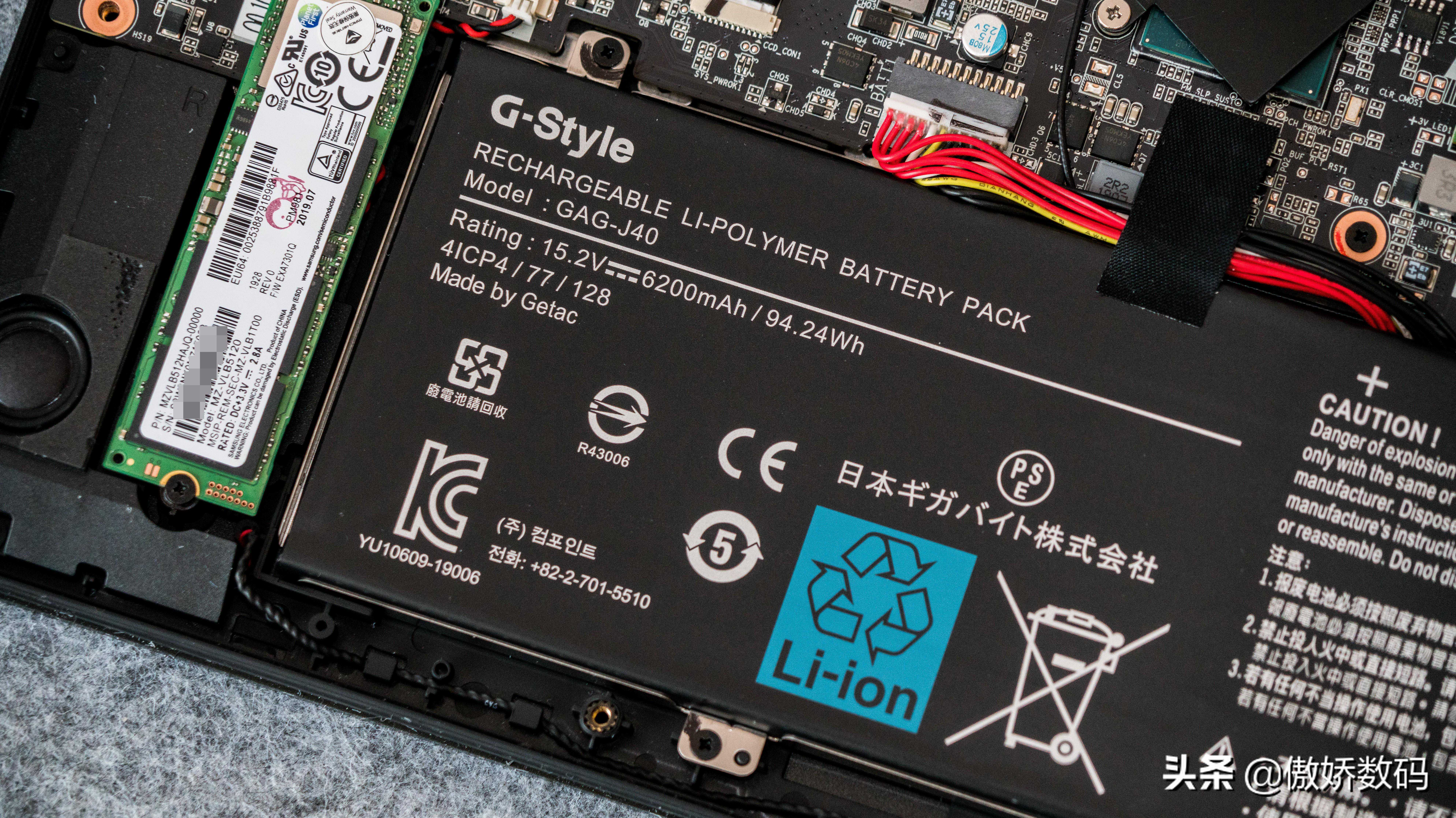 最下方就是产自Getac的锂聚合物电池了,容量高达94.24Wh。这个容量虽然玩游戏还是杯水车薪,但如果只是日常办公上网的话还是可以最少支持四五个小时的,比起传统的一两个小时就没电的游戏本还是要强不少