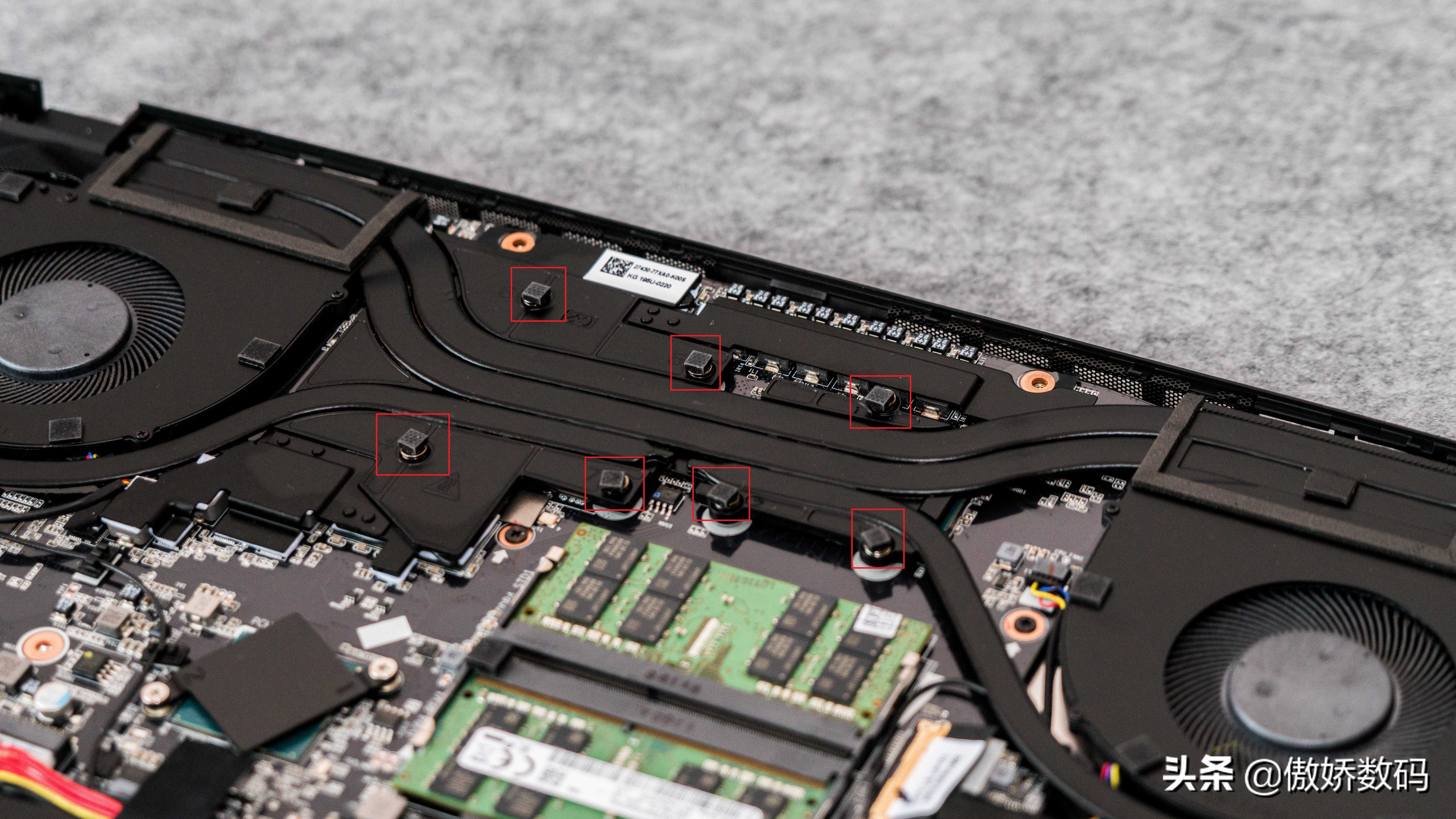 两侧的风扇和热管上也都有类似的胶垫设计,尤其是出风口边缘还有一圈独立的缓冲贴,细节满分